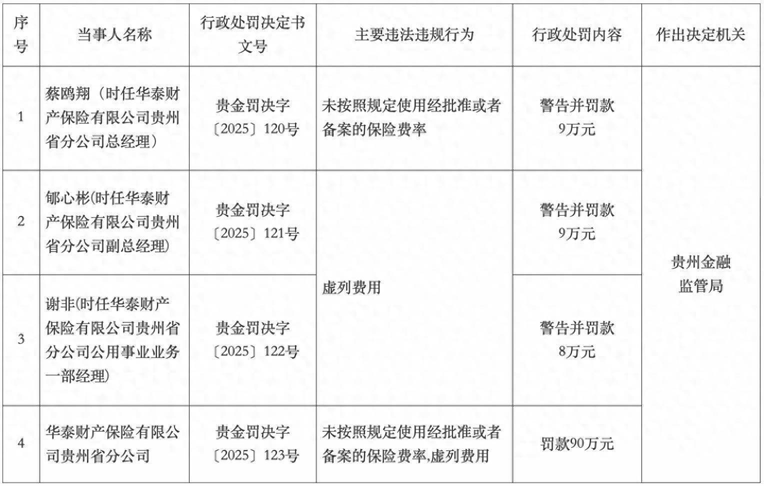 华泰财险贵州省分公司及3人,合收百万罚单!天津分公司、广东省分公司年内相继被罚